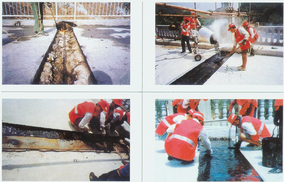 (5) 切縫:要求在切割伸縮縫之前必須對(duì)瀝青油面平整度進(jìn)行檢測(cè),根據(jù)實(shí)際平整度情況考慮是否適當(dāng)擴(kuò)大切割面的寬度(要求一邊最多比設(shè)計(jì)要求加寬30cm),如果加寬切割后路面平整度仍達(dá)不到伸縮縫安裝要求,要對(duì)對(duì)路面進(jìn)行返工處理,再進(jìn)行伸縮縫施工,以避免因?yàn)r青面層不平整而影響伸縮縫的施工質(zhì)量。如果平整度沒(méi)問(wèn)題,就根據(jù)施工圖紙要求確定開(kāi)槽寬度,準(zhǔn)確放樣,打上線用切割機(jī)割縫,鋸縫線以外的瀝青混凝土路面,就以貼膠帶紙或加蓋塑料布進(jìn)行保護(hù),以防止鋸縫時(shí)產(chǎn)生的石粉污染路面。鋸縫應(yīng)整齊、順直。切縫后應(yīng)立即用清水將石粉清除干凈,如果切縫是直接用干切,即沒(méi)添加水而進(jìn)行割縫,則應(yīng)立即用鼓風(fēng)機(jī)吹干凈,否則等過(guò)后(遇水)干掉就很難清洗,造成路面污染。 為了日后伸縮縫做到美觀順直可采用二次切縫。第一次切縫不切夠?qū)挾,兩邊預(yù)留5CM,等伸縮縫安裝好后,澆注伸縮縫砼之前再將這5CM切除,目的可以防止安置伸縮縫時(shí)破壞邊緣部分,造成縫不順直。