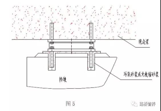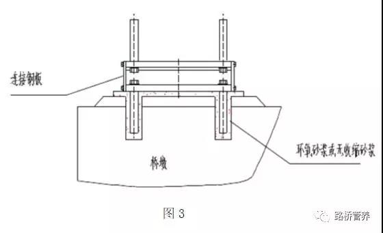 E、用環(huán)氧砂漿或無收縮砂漿灌注預(yù)留螺栓孔及支座底板墊層,待砂漿硬化后拆除四塊鋼鍥塊,并用砂漿填滿空位,砂漿要求灌注密實(shí)。如圖3。