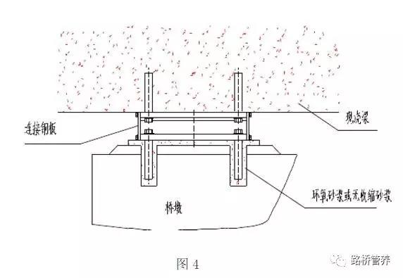 F、將支座頂板穿過地腳螺栓后扭上螺母(其外露螺桿高度不得大于螺母的厚度),作為現(xiàn)澆梁模板的一部分進(jìn)行澆注。為防止漏漿,可在頂板與模板之間四周空隙處用紗布或軟木板填充。以后拆除模板時(shí)再除去。如圖4。